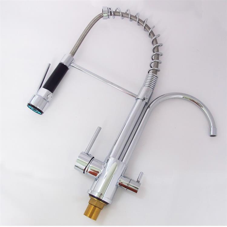 The pub style 3-way kitchen water faucet  is 3 way kitchen faucet, the bold water outlet piple is with spring, which is made for washing dishes, vegetable, foods etc, and there is a button on the water mounth to control the way deof water, the dense way and small way. The other water outlet is conneect to purified water,the water come out from this is drinkable. That isreason why it's so suitable in pub.